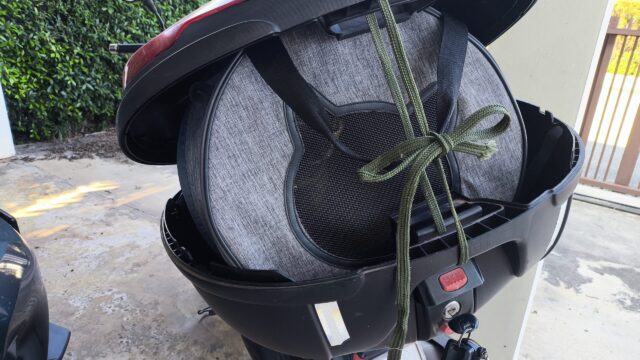 バイクのトップボックスにキャリーケースを入れて落ちないように箱の蓋を紐で固定して準備完了。