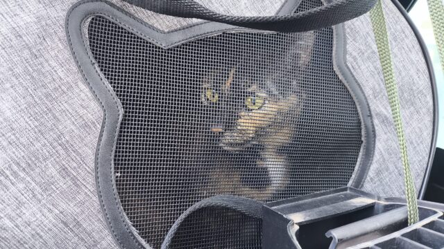 このキャリーケース?は病院に連れて行く時だけ出てくる物なので、ケースを覚えているプルさんは静かに屋外に脱走しようと移動していたけど、俺氏が捕まえてケースにイン。