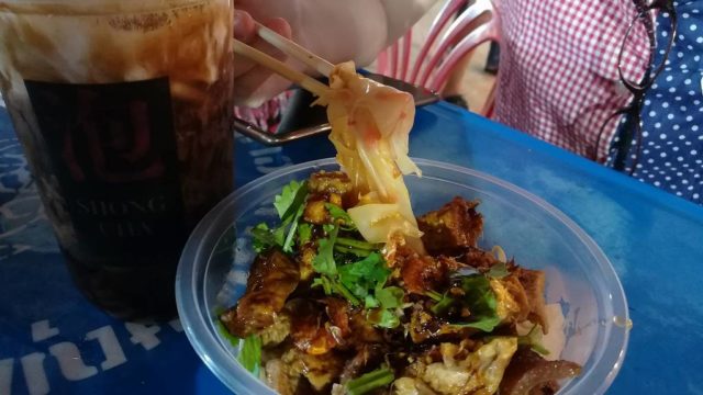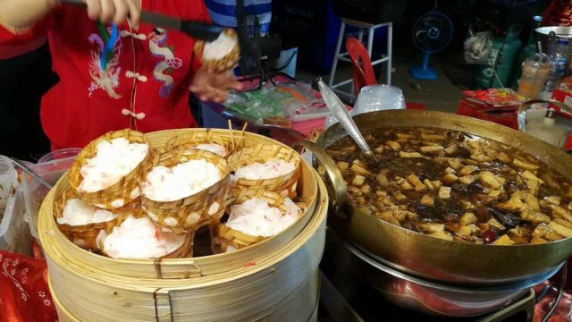 見た目中華系の麺類です。蒸籠で蒸されている「センヤイ(平麺)」にコクのあるスープをかけて頂くタイプ。1杯50バーツと結構高めでした。