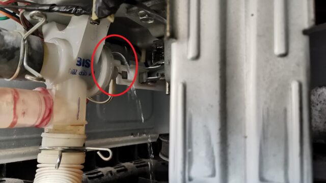洗濯中の洗濯状況と水漏れを確認すると脱水等の排水時に水が下から漏れてくる。つまり洗濯槽の水漏れではなく「脱水弁」周辺の排水系統に問題があると推察。