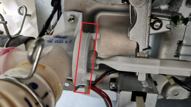 破損部の正式名称は知らんけど「脱水弁の蓋」と呼んでおこう。この蓋の奥に脱水弁が有り、右側の棒状の物で脱水弁を操作するのよ。