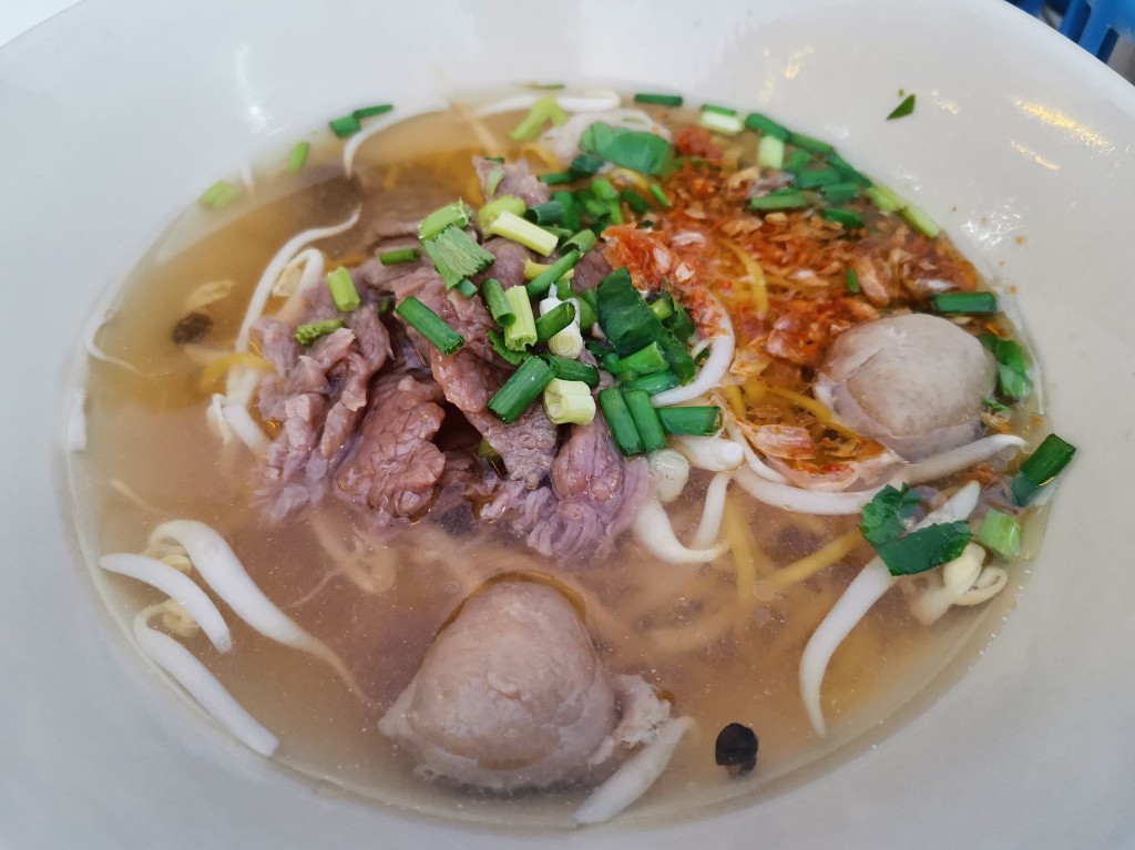 前回のように「持ち帰りのみ」なら別のお店に替えようと相談してたけれど、ちゃんとお店で食べられるようになっていたのでそのまま着席して牛肉ラーメンとムーサテを頼みました。ムーサテ40バーツ、牛肉ラーメンは1杯35バーツで合計110バーツです。