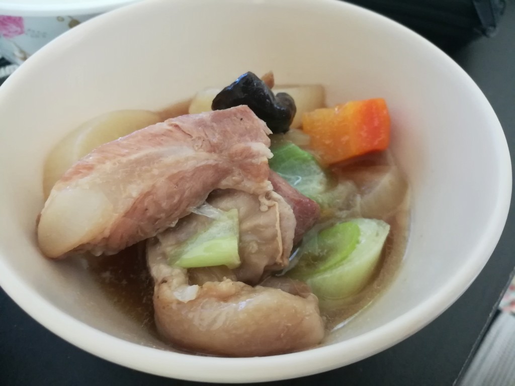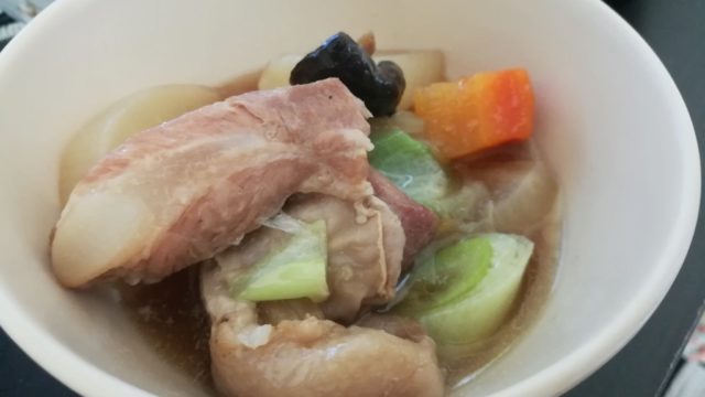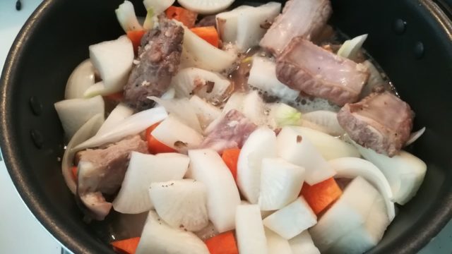 今回は大根の下茹でとかもせず、肋肉を焼いた鍋にそのまま根野菜と椎茸をぶっ込んで1時間煮込んで完成。味付けは醤油・酒・みりん・砂糖と創味シャンタンを適当に入れた。
