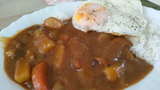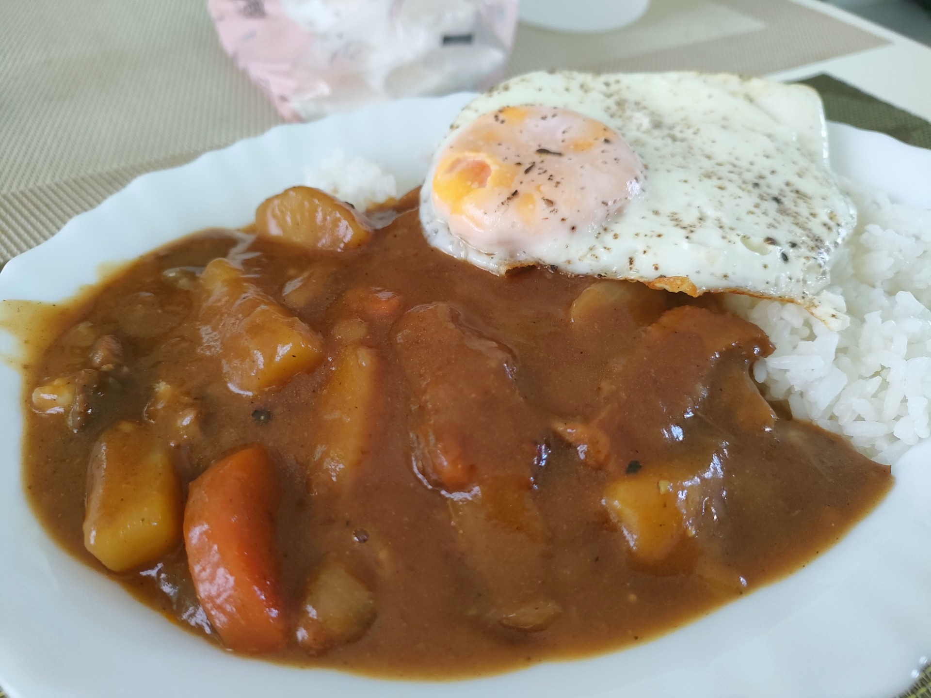 牛すじを煮込んだスープでカレー作ったので美味しさマシマシです。目玉焼きの黄身が固くなり過ぎは失敗。