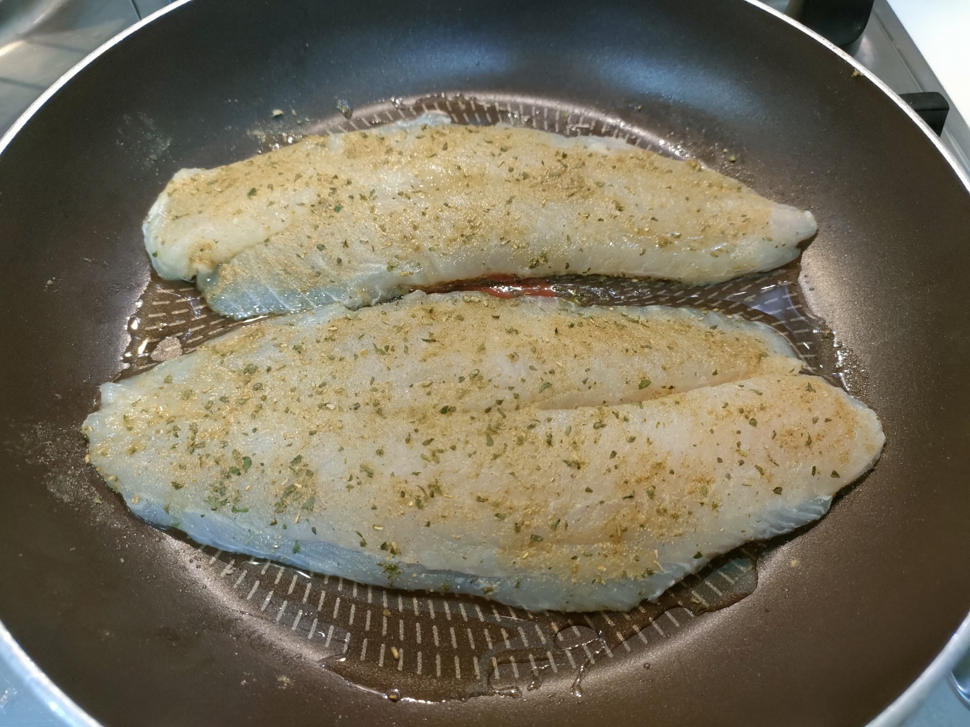 ナマズ肉にハーブミックスをまぶしてムニエル風?裏返す時に失敗して衣部分が剥がれてしまい超残念。